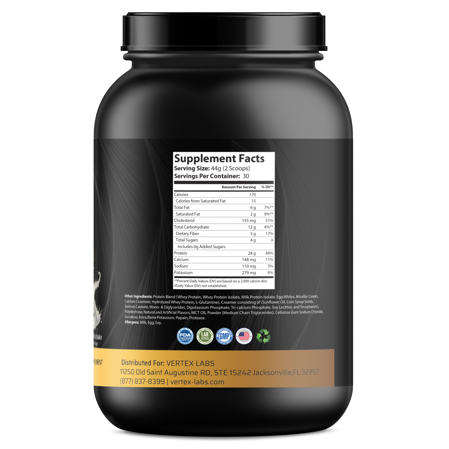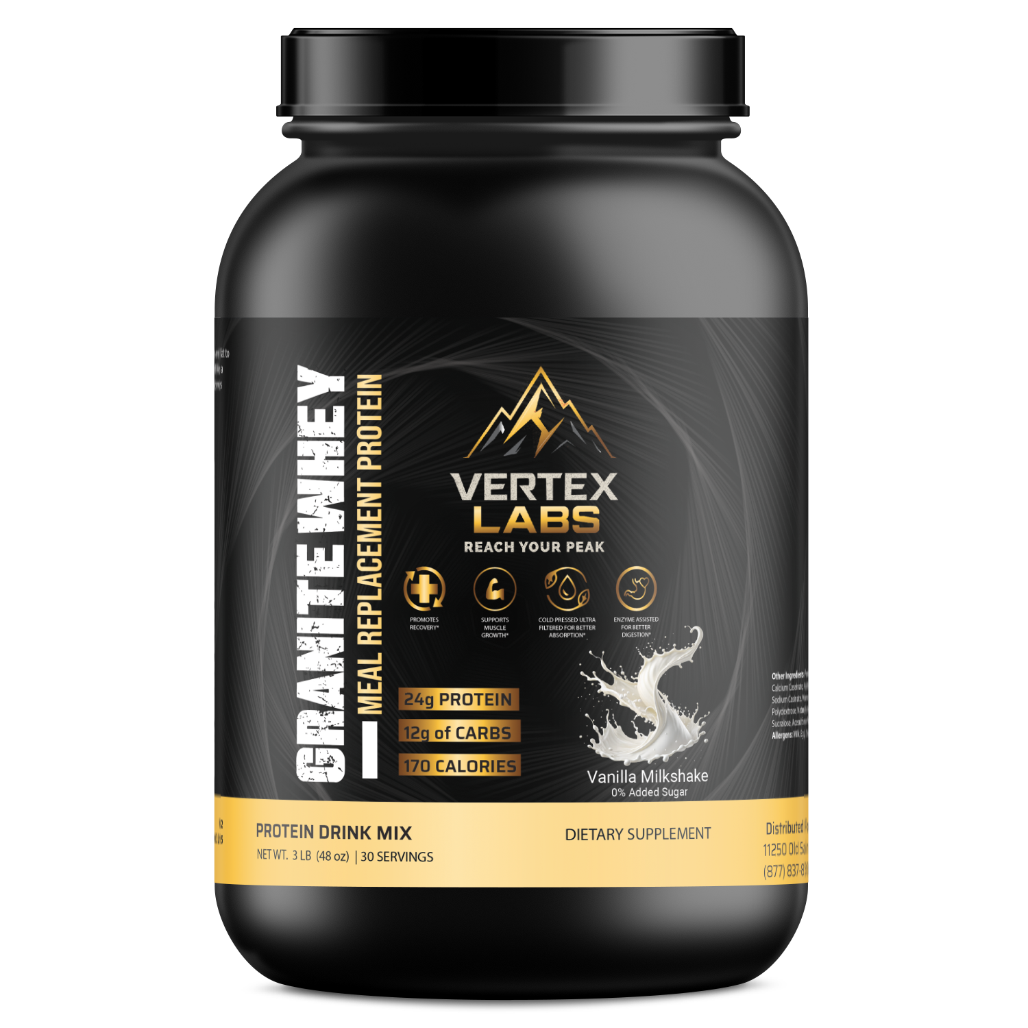 Granite Whey Meal Replacement Protein by Vertex Labs is a complete performance formula designed to fuel your day, build lean muscle, and support sustained energy when life doesn’t stop. With 24g of our high-quality protein blend, which includes whey isolate, micellar casein, egg whites, and hydrolyzed whey, this powerful meal replacement delivers both rapid and sustained amino acid release. Combining fiber, MCTs, and digestive enzymes, Granite Whey Meal Replacement Protein satisfies hunger, supports digestion, and promotes recovery anytime, anywhere.