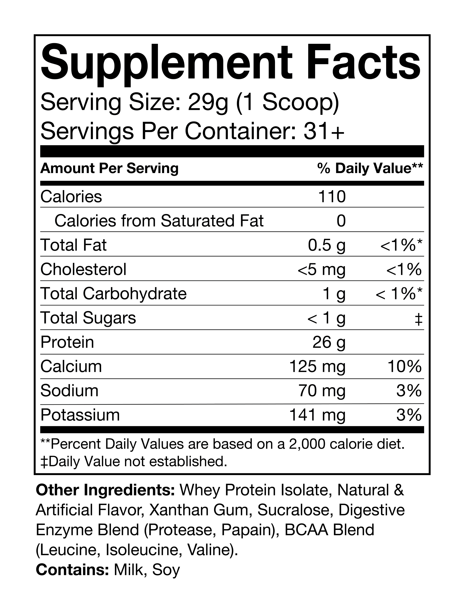 • Whey Protein Isolate (26g): Rapidly absorbed, low-lactose protein to support lean muscle growth and recovery.