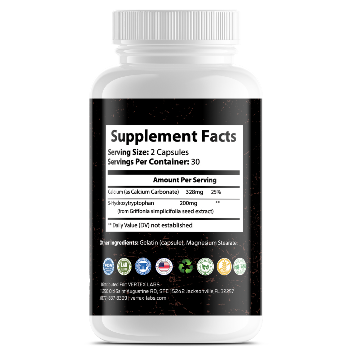 support in managing stress and emotional well-being, 5-HTP by Vertex Labs offers a clean, effective way to encourage serotonin production, your body’s natural "feel-good" neurotransmitter. With an optimized blend of 5-HTP and calcium for synergistic support, this supplement is ideal for individuals seeking enhanced mood, calm, and improved sleep cycles.
