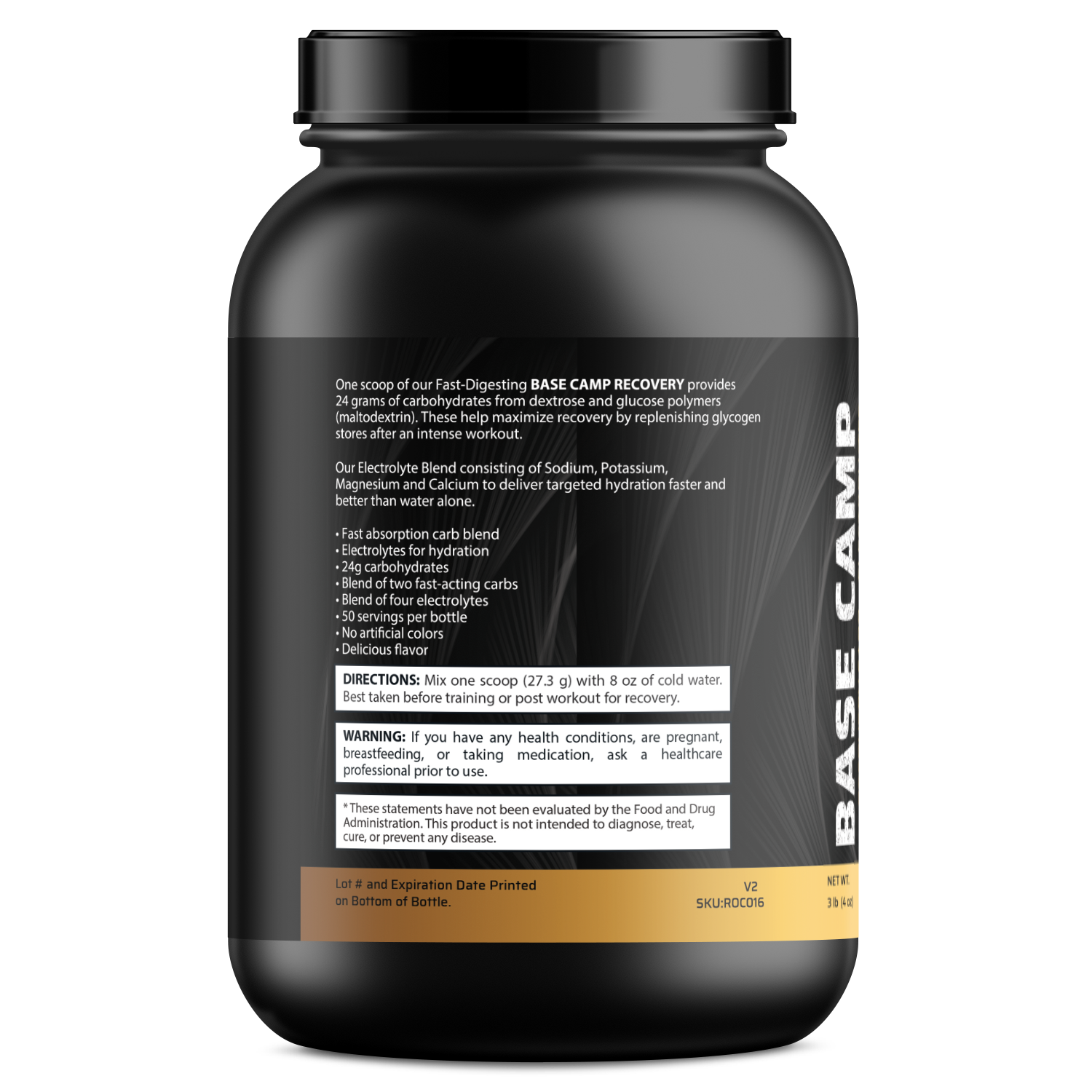 real progress begins. Base Camp Recovery Carb + Electrolytes is built to replenish glycogen stores, restore hydration, and prime your muscles for the next workout. With 24g of fast-acting carbohydrates and essential electrolytes, this formula is perfect for post-workout recovery or intra-workout fueling. Whether you're chasing gains or grinding through endurance sessions, Base Camp delivers a performance-driven boost that keeps you coming back stronger.