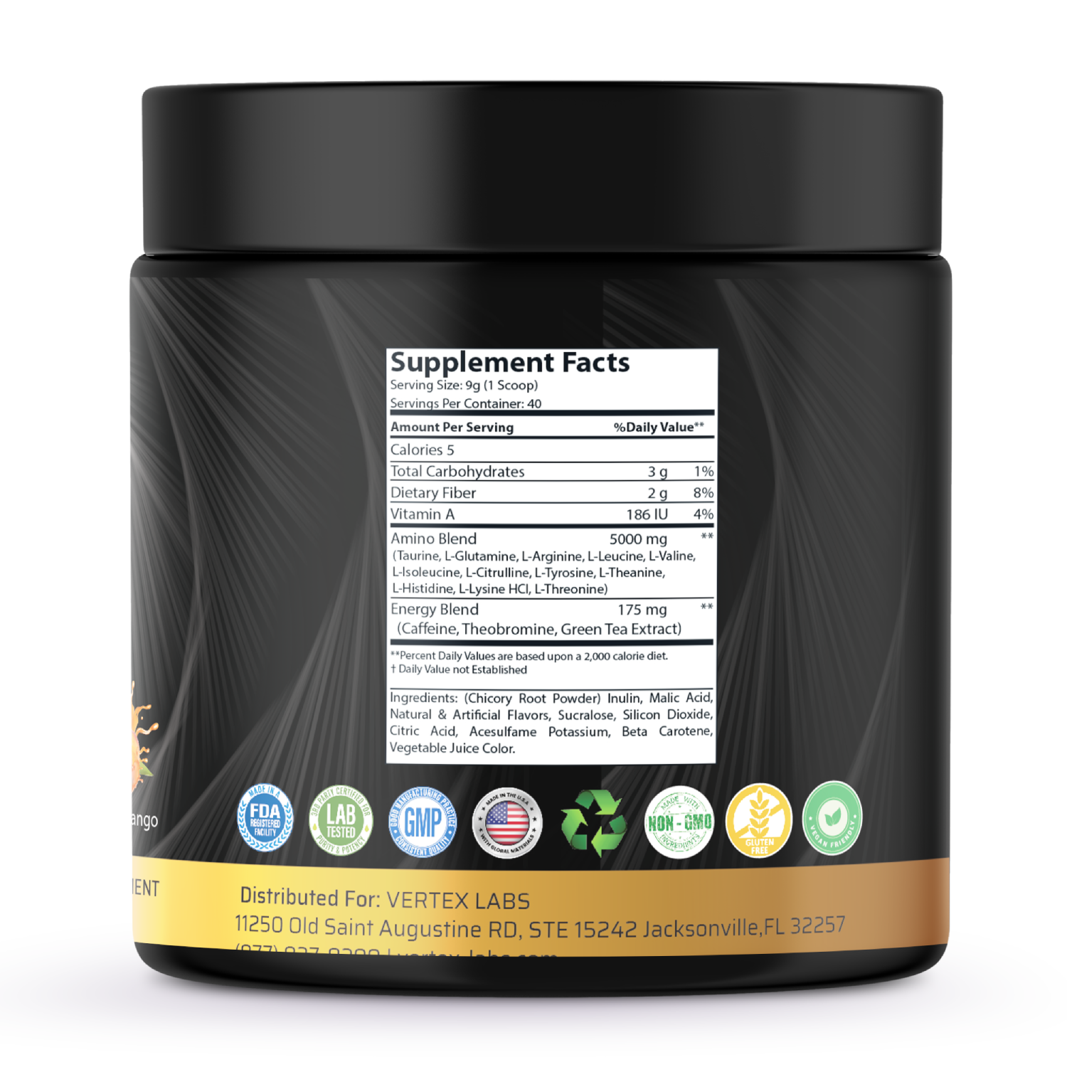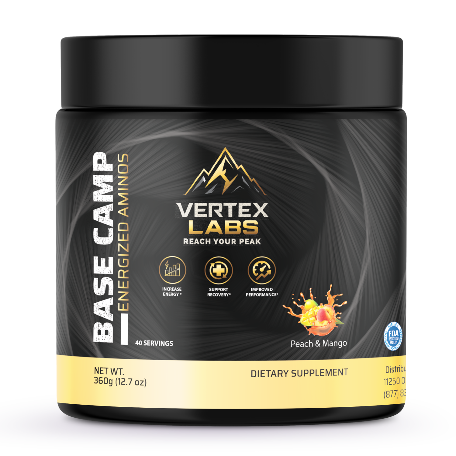 When your body needs recovery and your mind needs fuel, Base Camp Energized Aminos by Vertex Labs delivers both in one clean, refreshing scoop. This hybrid amino acid and energy formula is designed to support hydration, muscle recovery, and clean mental focus throughout the day, whether you're training, working, or staying active. At the center of the formula is a comprehensive 5000mg Amino Blend, led by Taurine, L-Glutamine, and L-Leucine, to protect lean muscle, reduce fatigue, and aid in repair. A precise Energy Blend featuring Caffeine, Theobromine, and Green Tea Extract keeps your energy steady and your focus dialed in without the crash.