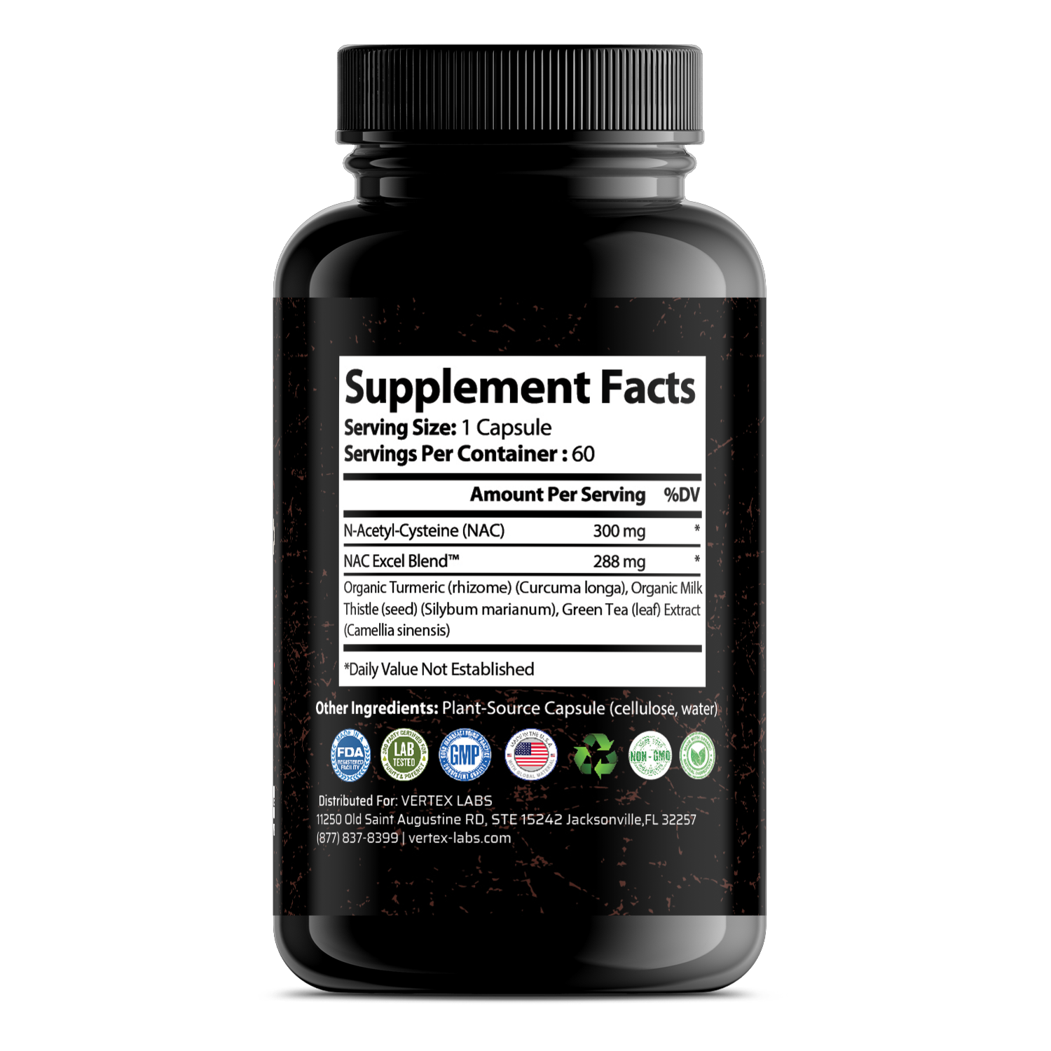 Don’t let environmental stressors or lifestyle habits take a toll on your body’s resilience. NAC Plus N-Acetyl-Cysteine by Vertex Labs supports your natural detoxification pathways and cellular defense system, formulated to help promote lung health, liver function, and immune support. With N-Acetyl-Cysteine (NAC) and a synergistic blend of antioxidants like Organic Turmeric and Green Tea, this formula helps replenish glutathione levels, the body’s master antioxidant. Each capsule delivers a targeted blend of scientifically backed ingredients, no fluff, no fillers.