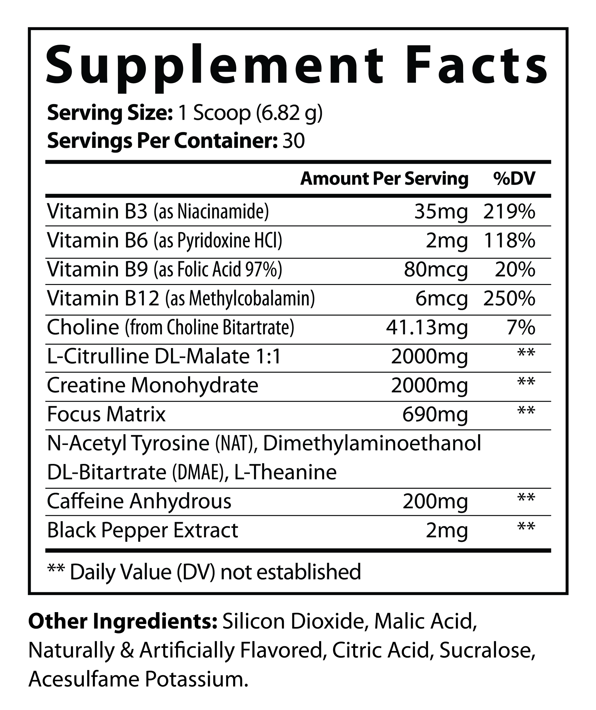 • Focus Matrix (800mg): Featuring N-Acetyl L-Tyrosine, Choline Bitartrate, DMAE, L-Theanine, and Bacopa Monnieri for elevated concentration, alertness, and mental stamina.