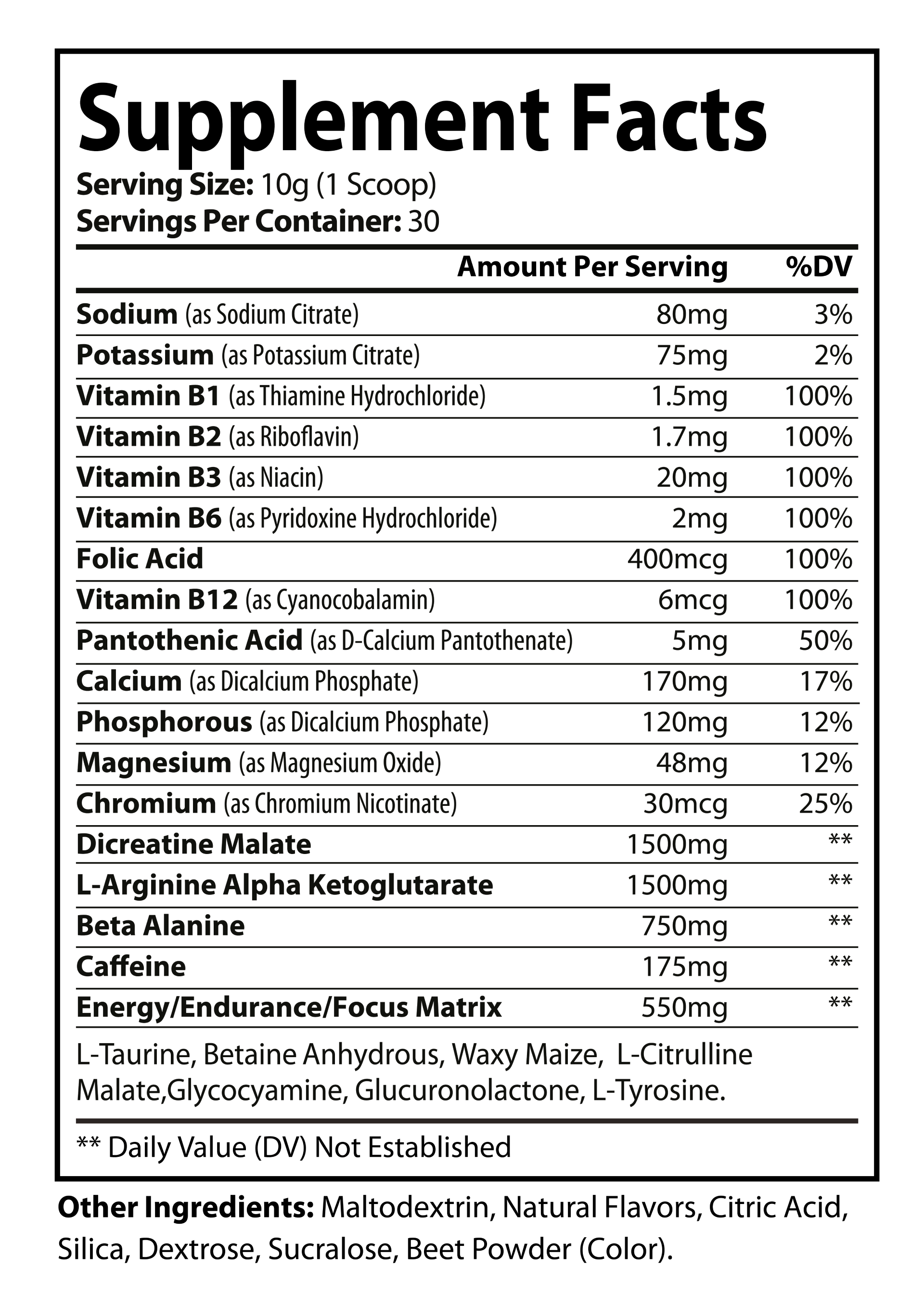 Suggested Use: Stir 1 rounded scoop with 6-8 ounces of cold water and consume 30 minutes before your workout. Do not exceed 2 scoops daily.
