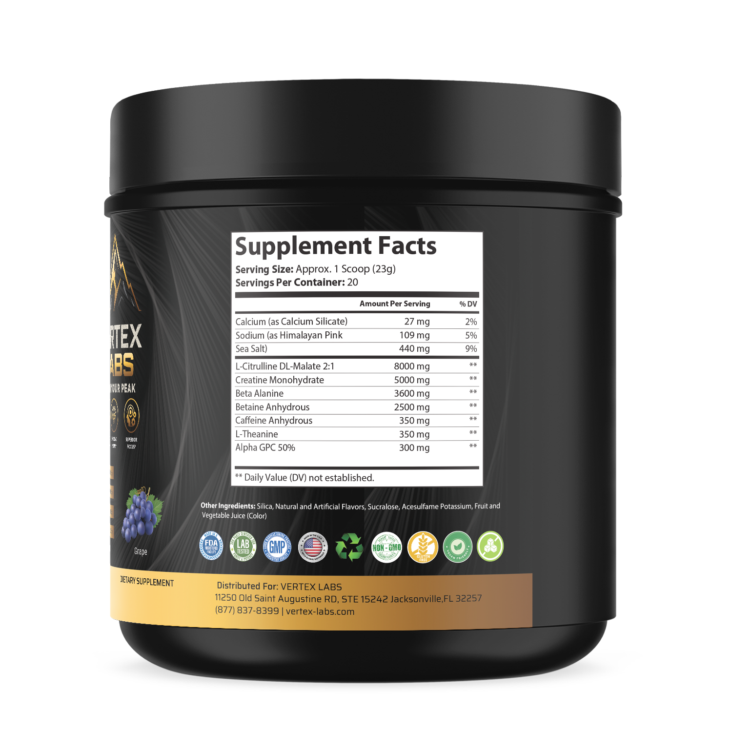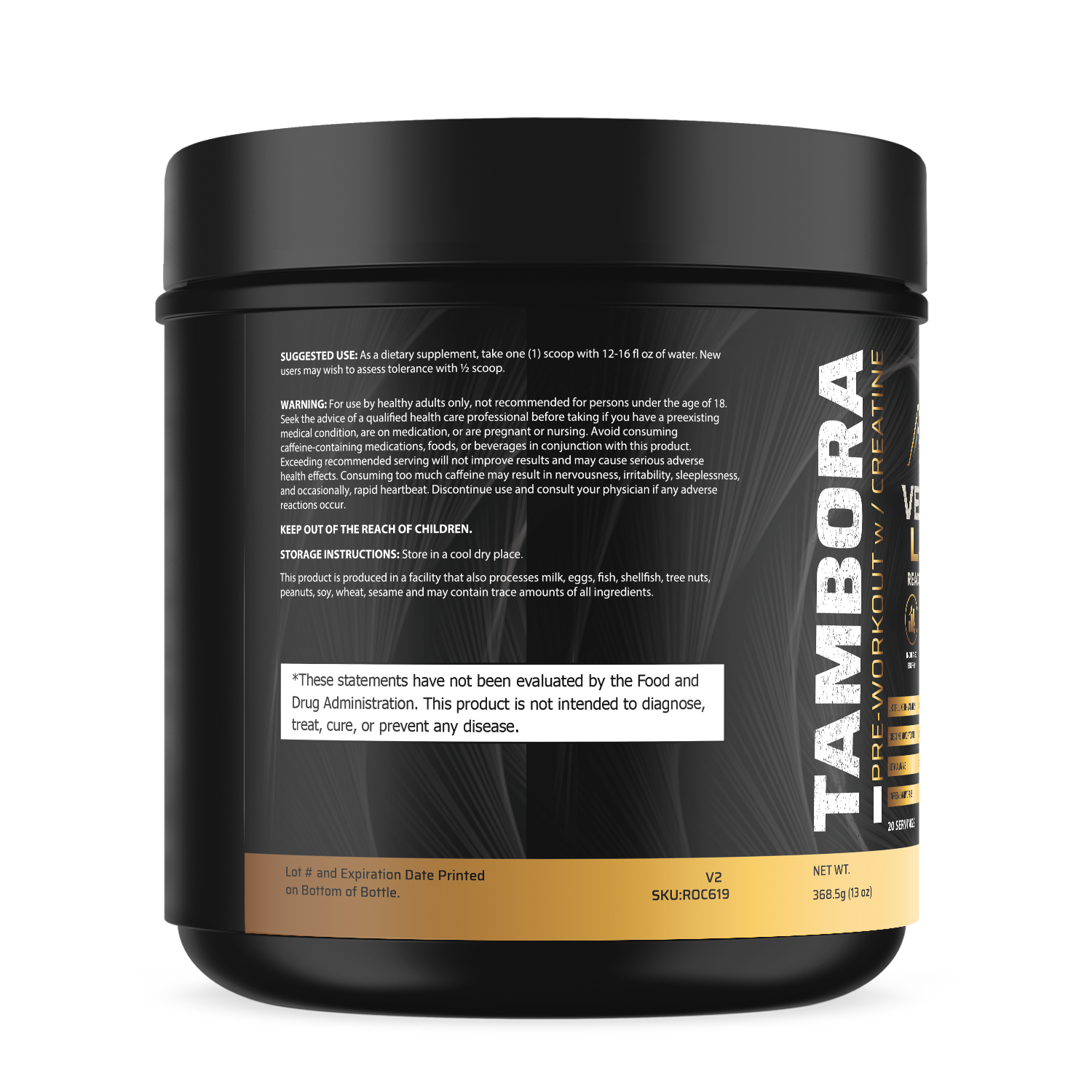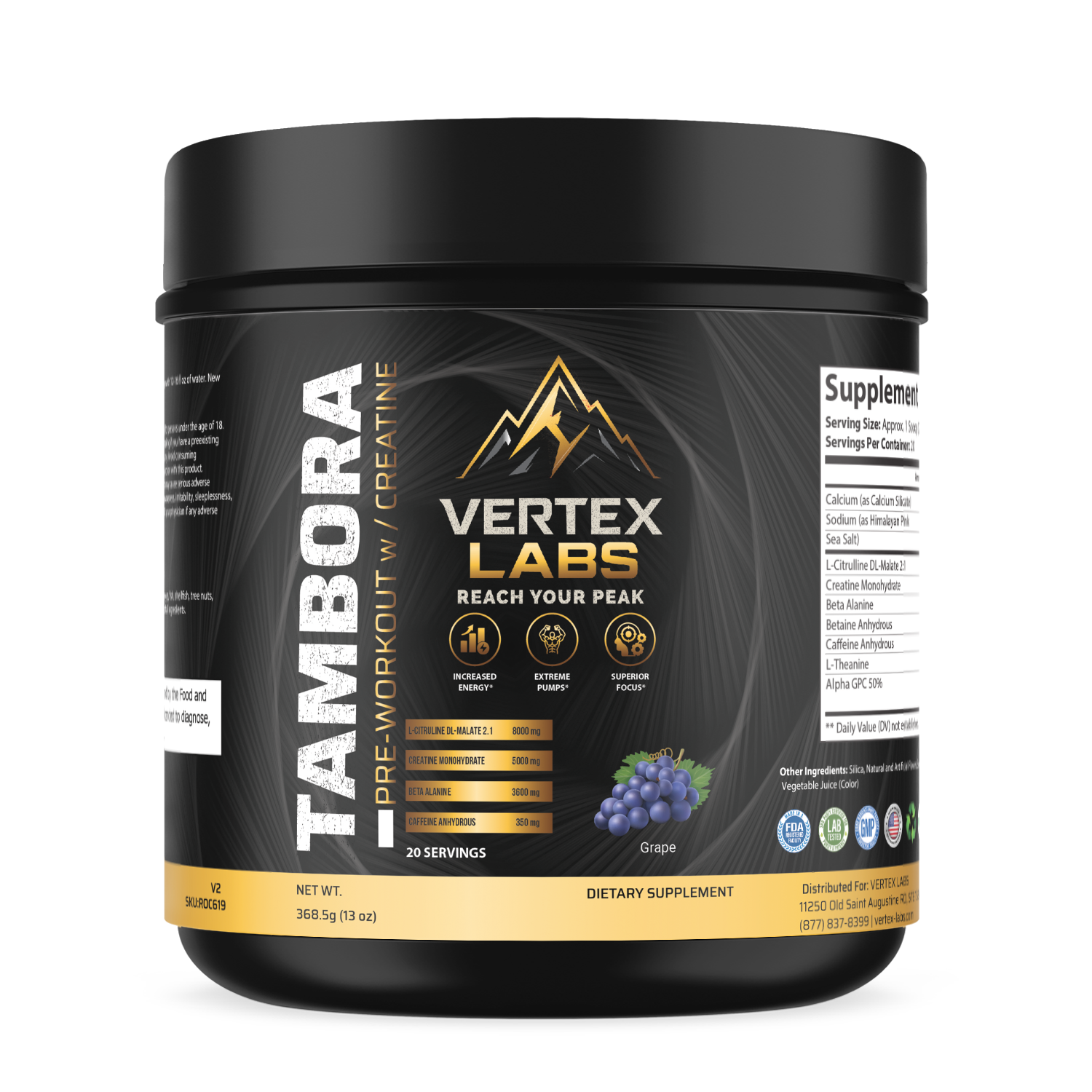Every incredible journey starts with a spark and Tambora Pre-Workout with 5g of Creatine by Vertex Labs delivers an eruption of clean, sustained energy to ignite your potential and elevate your performance. Packed with 5g of Creatine Monohydrate, one of the most researched and trusted ingredients in sports nutrition, Tambora supports explosive strength, enhanced power output, and faster recovery between sets. When combined with L-Citrulline DL-Malate and Beta Alanine, it becomes a high-performance pre-workout built to fuel your most intense training sessions and help you reach new heights.