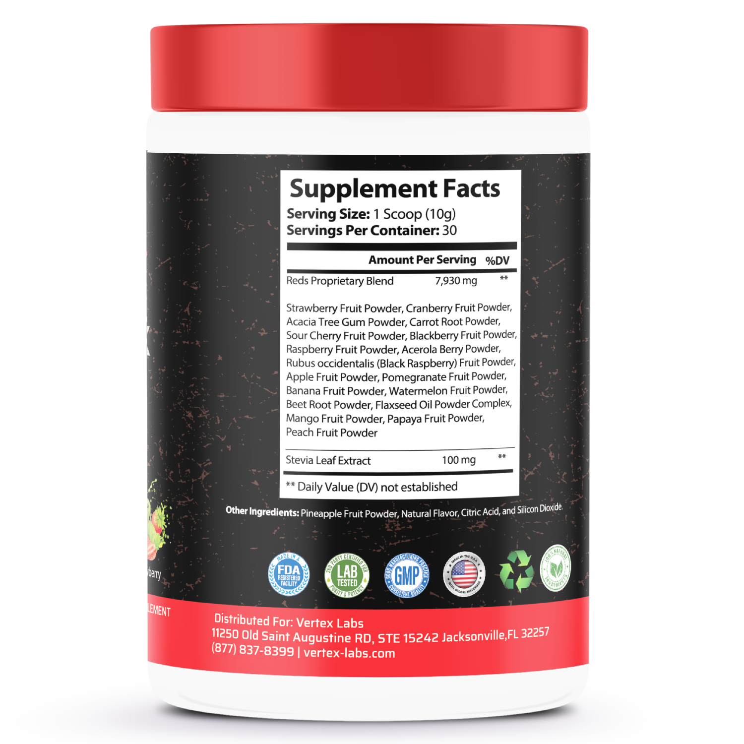 • Reds Proprietary Blend (7,930mg): Features strawberry, cranberry, blackberry, raspberry, black raspberry, cherry, apple, pomegranate, banana, watermelon, peach, mango, and papaya fruit powders to deliver high-potency polyphenols, flavonoids, and natural antioxidants.