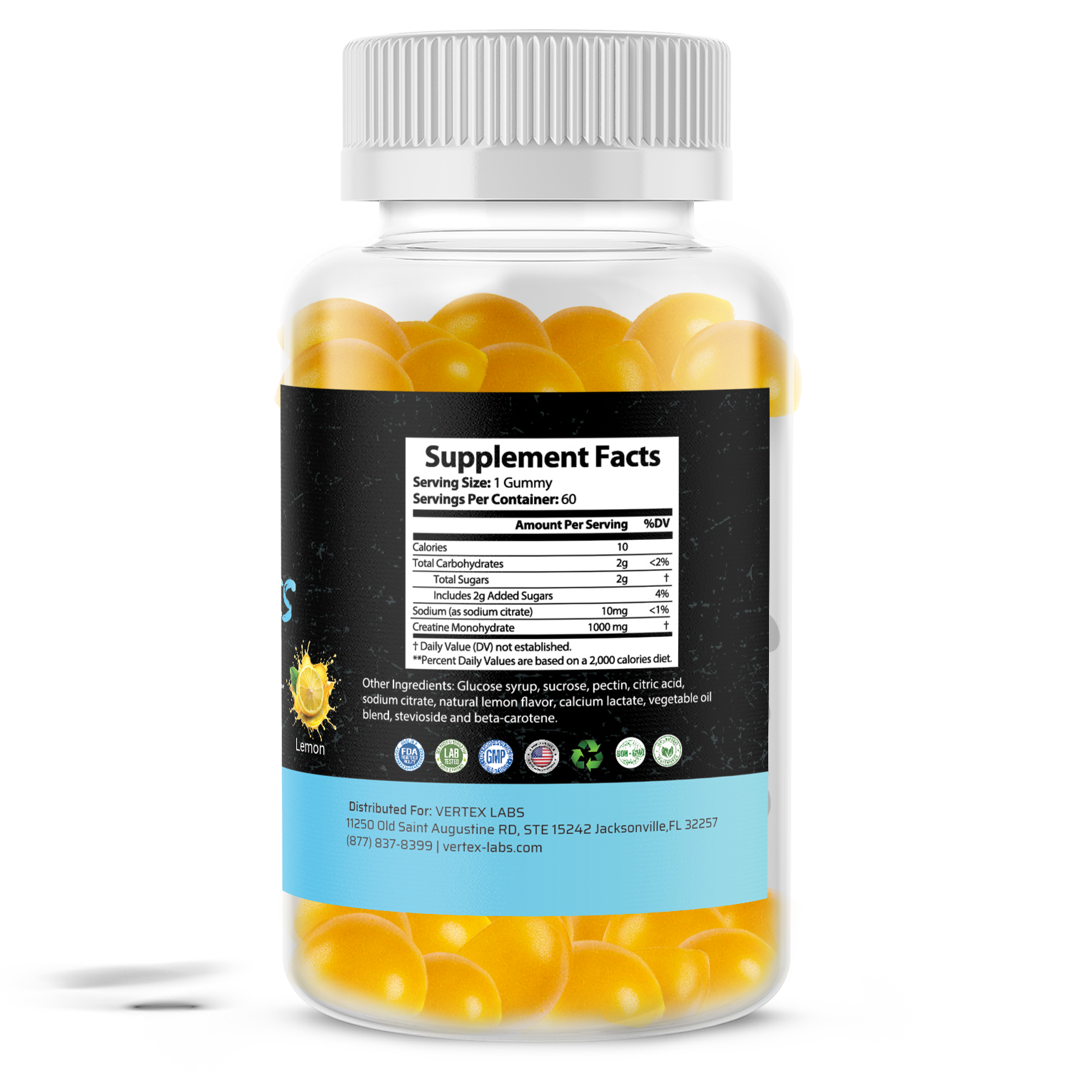 make it easier than ever to stay on track. Each lemon-flavored gummy delivers a precise dose of 1000mg of pure Creatine Monohydrate, helping to increase muscular strength, enhance ATP production, and improve performance across training sessions.