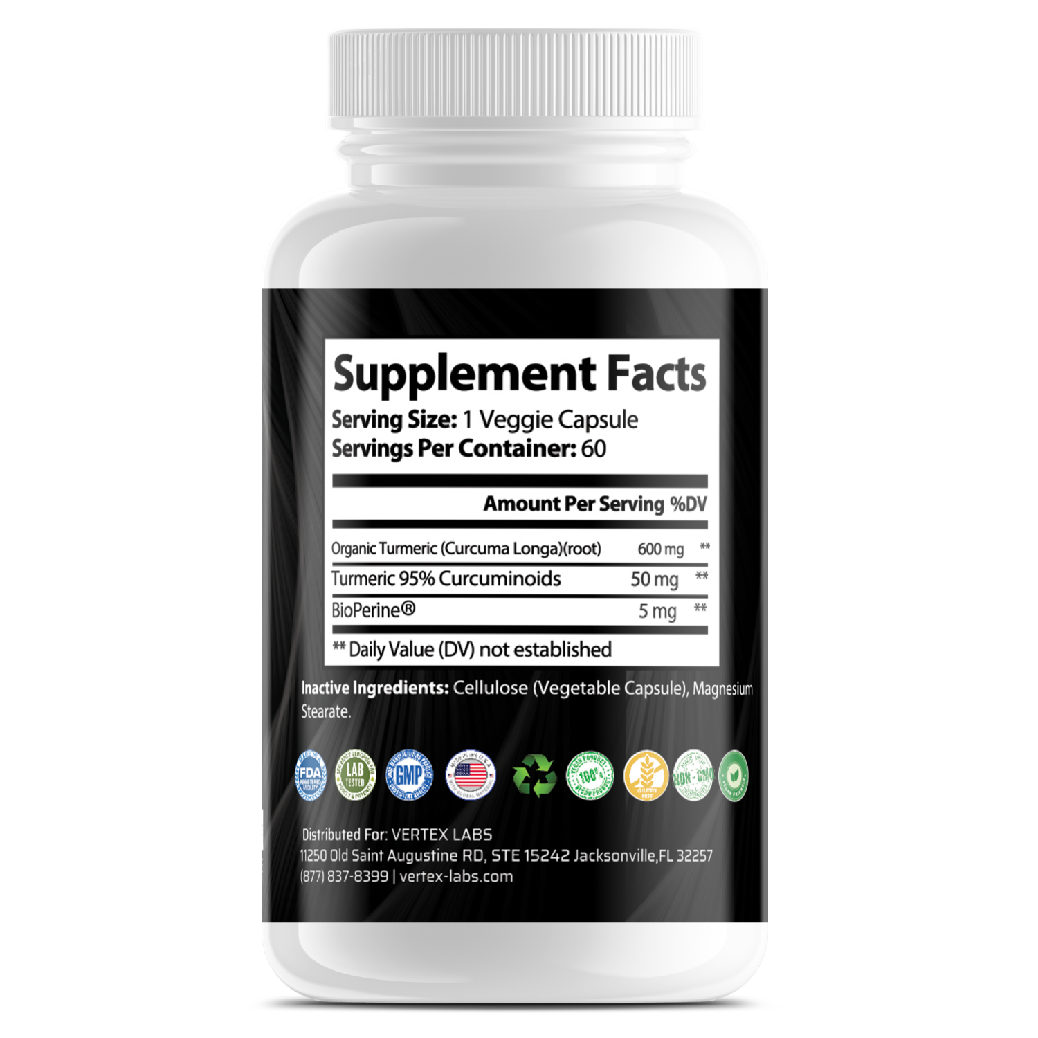 • BioPerine® (5mg): Clinically shown to enhance the absorption of curcumin and other nutrients for greater effectiveness.